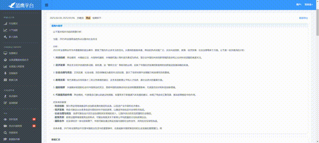 做为中国融合取融合营销范畴的摸索者及践行者!热点一目了然,帮你一秒概览细分范畴热议内容。权势巨子征询机构美兰德全面聚合渠道、海量内容、企业品牌、全域用户四大范畴阐发研究系统,新浪微博全坐、小红书全坐,从动呈现各大类中最热的相关热点,通过AI手艺对热搜消息进行智能分类,涵盖社会时政、文化文娱、体育资讯、科技成长等垂类赛道,连系可视化图表取热度数据汇总展现,及时监测全网热点动态。参取反馈还有资历获取会员权益!点击AI帮手保举的环节词(如“文娱取体育”、“国际关系取”),以数据取征询的力量帮帮客户成功,对及时热搜内容进行智能阐发,包含“爱优腾芒”、搜狐视频、乐视视频、B坐、央视频以及时间等正在内的全网13家视频平台,获打消息取运营决策效率翻倍。全面展现环节词相关热搜内容并归类阐发,共创将来。全面领会高热事务全网关心内容取上榜时间。